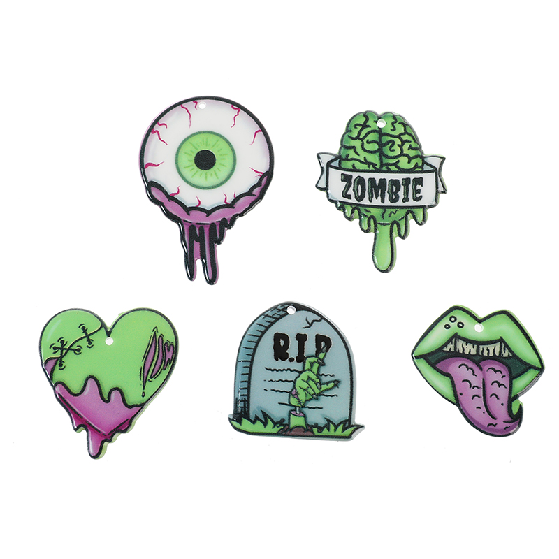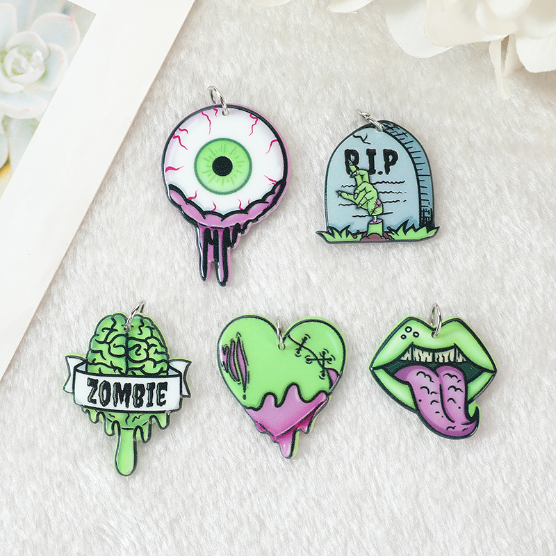 • 10-piece set of Halloween-themed charms, including zombie brain, heart, mouth, eyeball, and R.I.P tombstone.