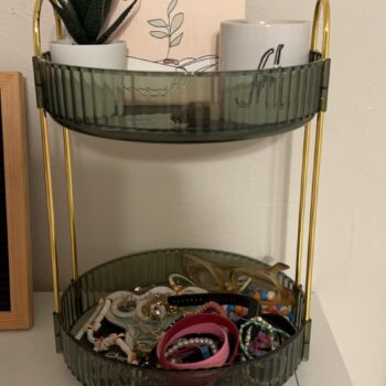 This is incredibly handy! I have a small vanity, but the three-tier version isn't too tall. It holds all my hair products, skincare, and makeup, making everything easily accessible. Plus, it’s really cute and fits well with my decor. I highly recommend it.