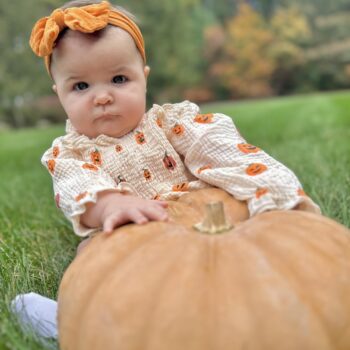 I'm in love with this jumpsuit! The pumpkin print is so cute and festive, perfect for autumn. And the bow headband? Adorable!
