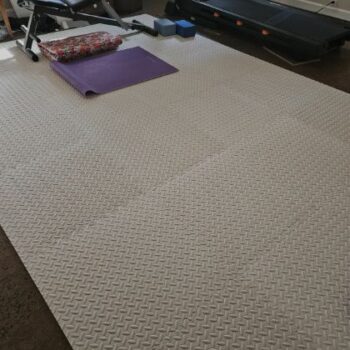 I purchased this "exercise mat" with the intention of using it as a secure pad under a large rolling tool cabinet. It has proven to be highly effective in this role, providing stability to the cabinet on the concrete garage floor. Assembling it was a breeze, and it will be easy to clean when needed. Additionally, its generous width allows me to stand comfortably on it while working in the tool cabinet, making it a practical choice. Piecing it together like a puzzle to fit my desired size was the perfect finishing touch.